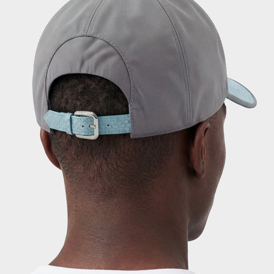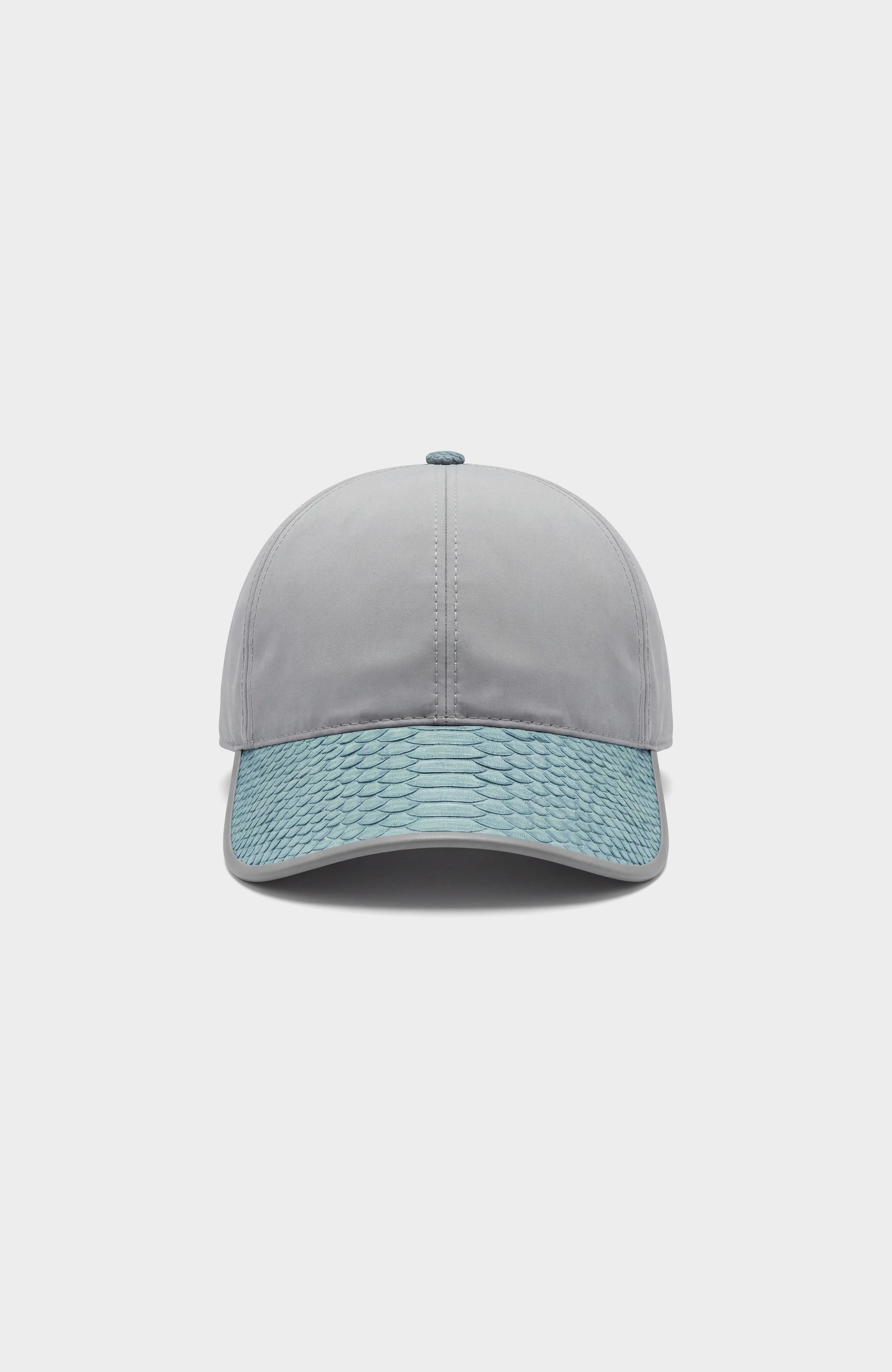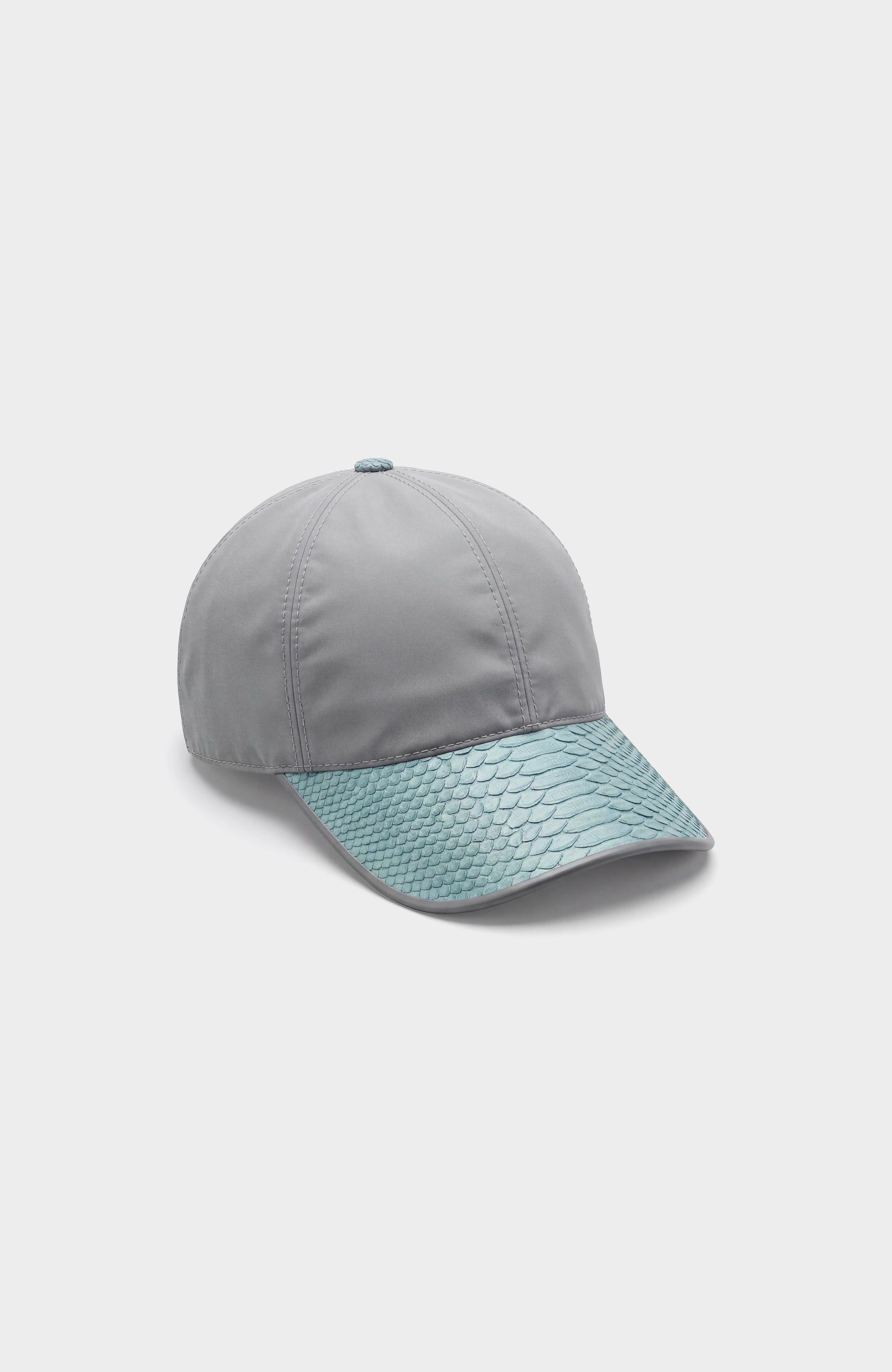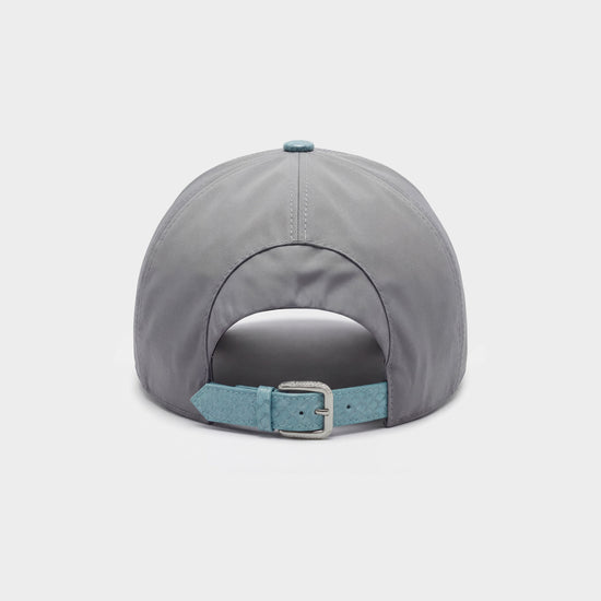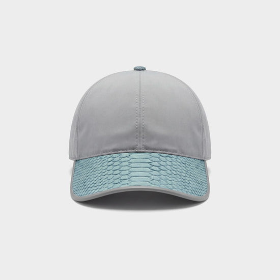 Casquette en nylon gris avec visière et lanière arrière en véritable python bleu ciel, pour un contraste luxe et moderne.