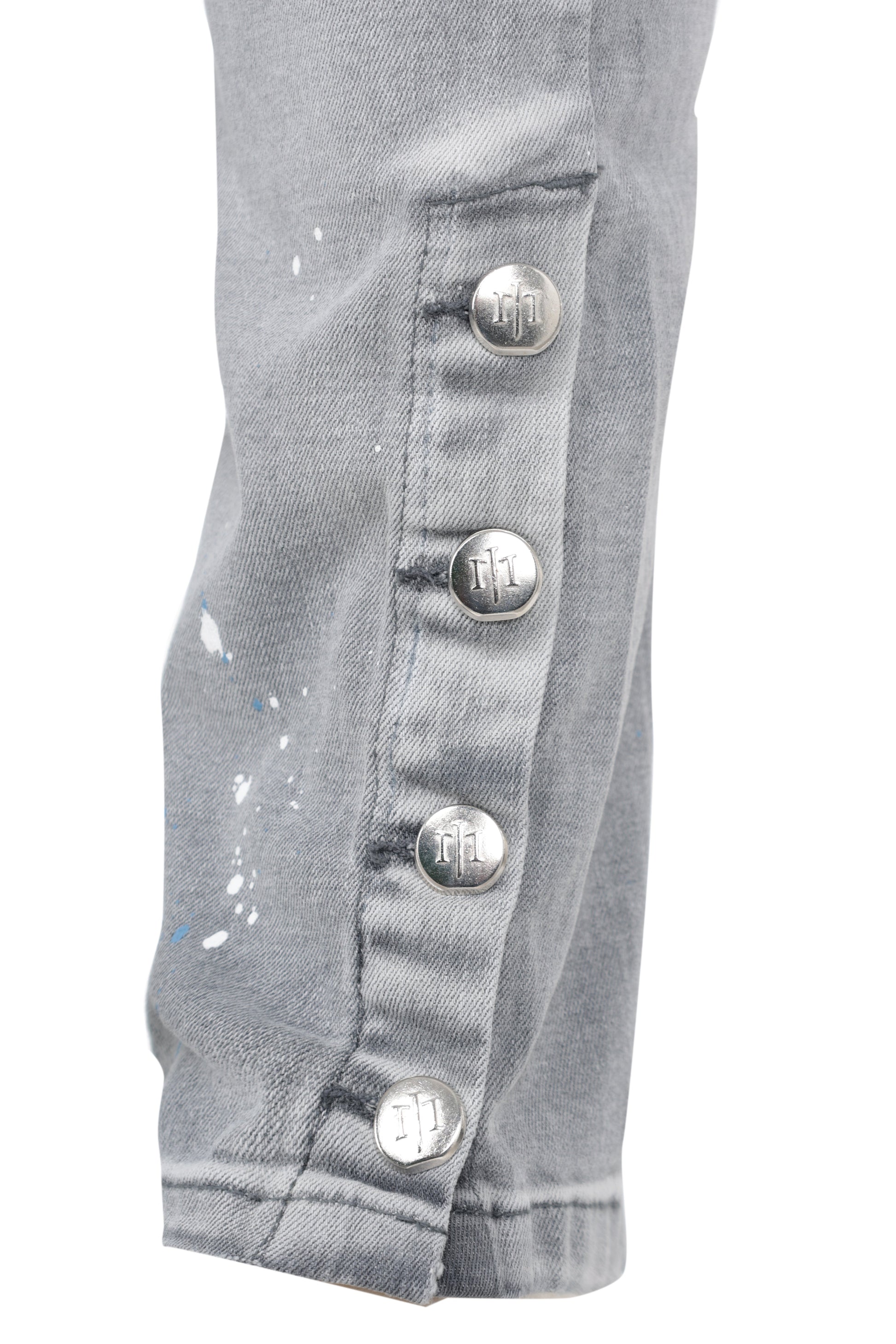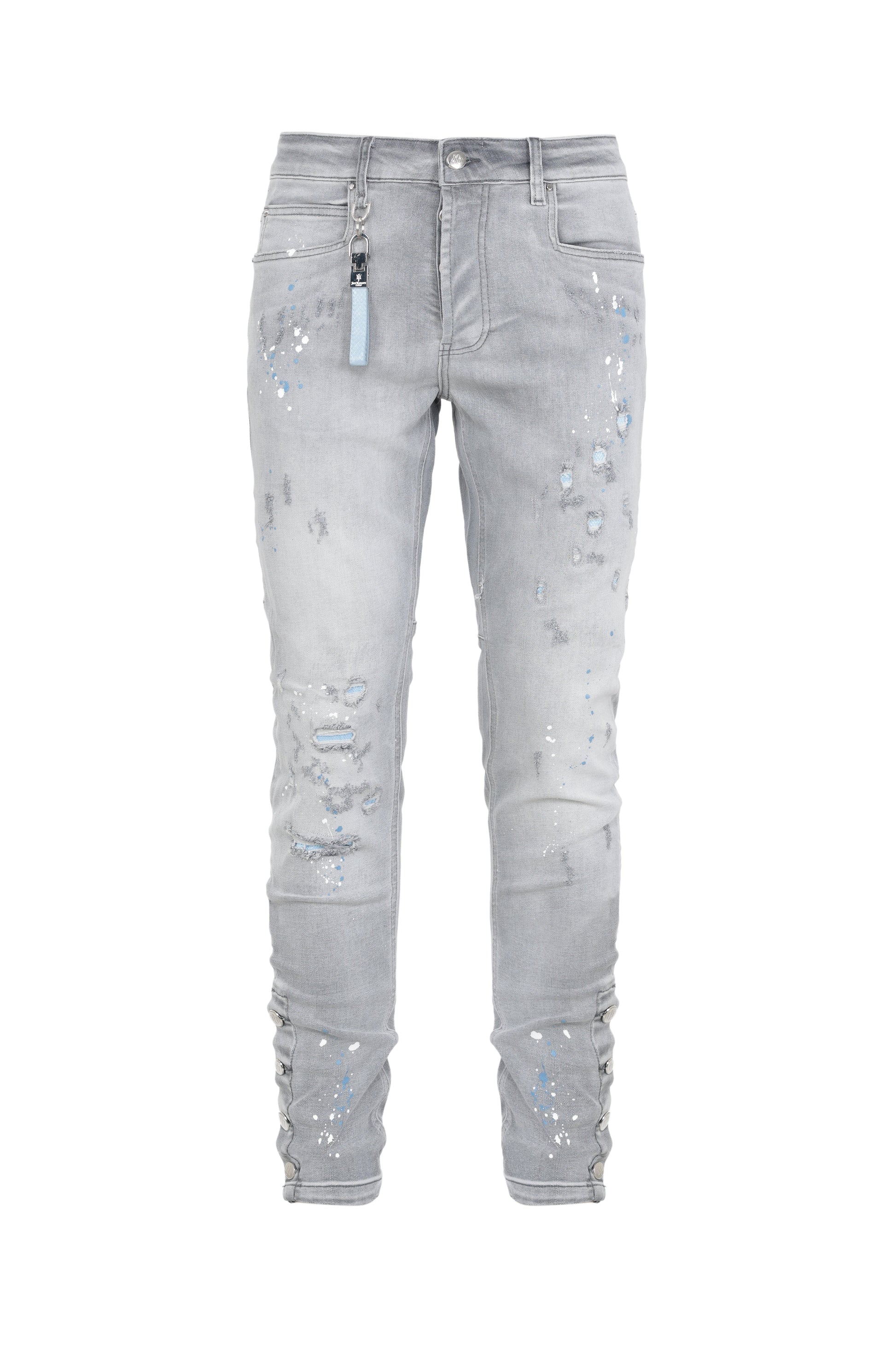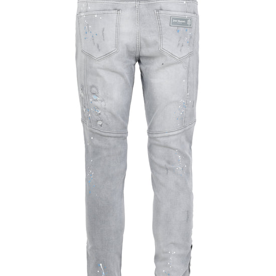 Jean gris délavé avec taches de peinture blanche et bleue silicone. Joey martins à l’arrière de la poche clé en diamant, imprimé pyton bleu