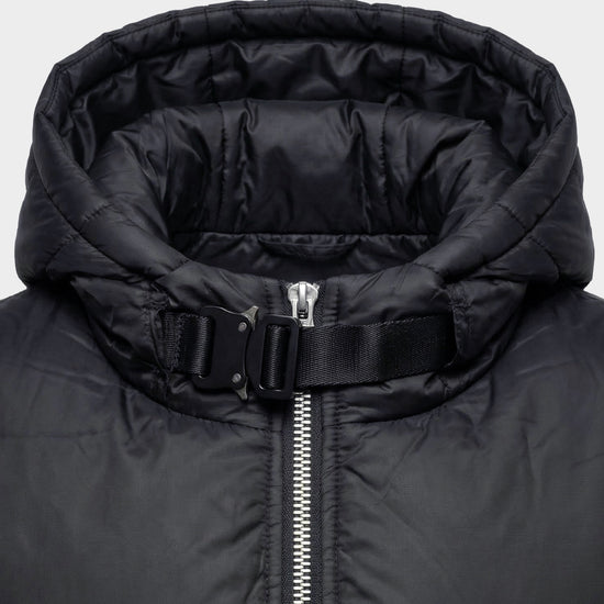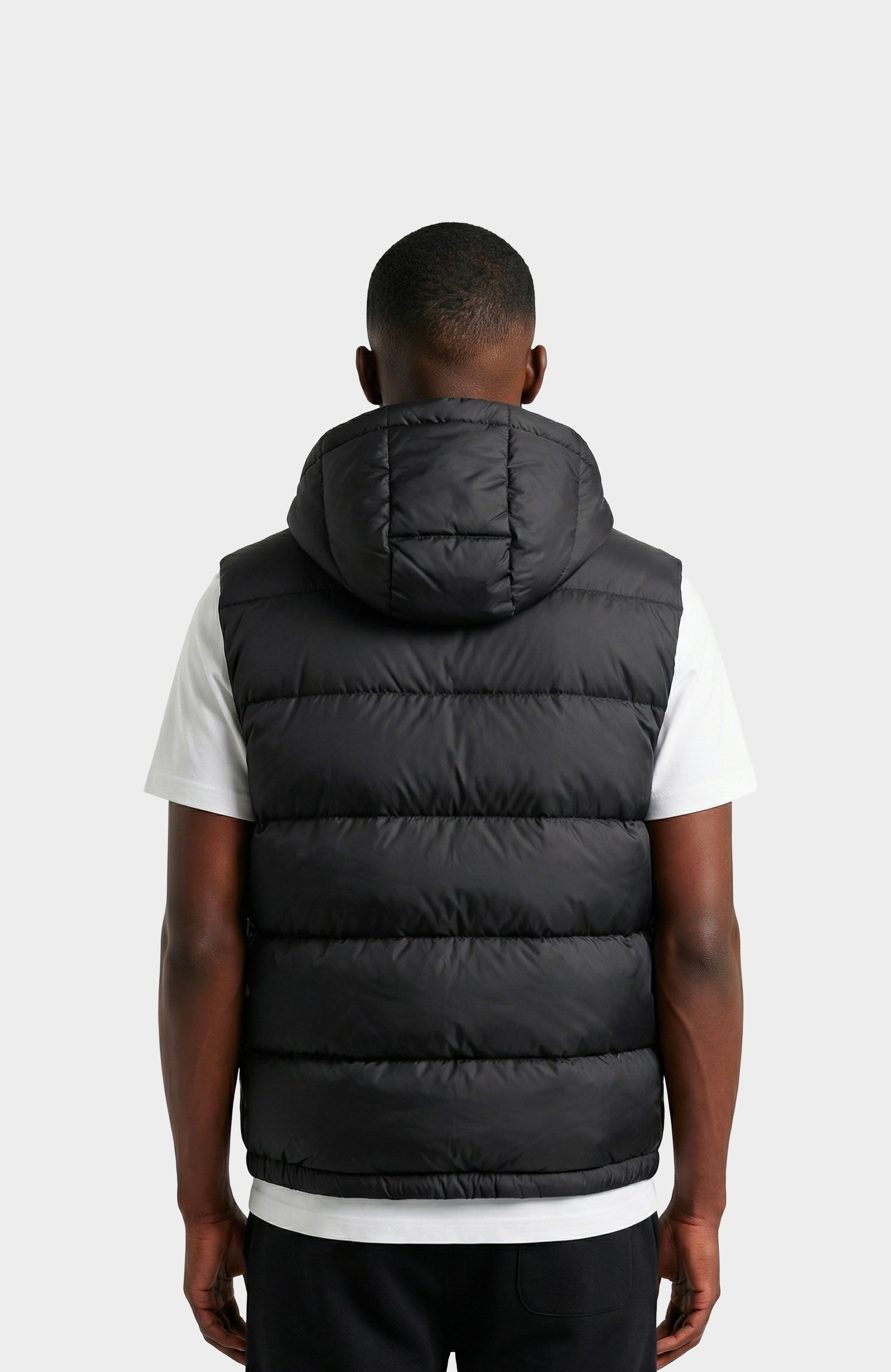 Doudoune sans manches noire avec capuche, zip métal argenté et sangle à boucle au col. Poches zippées doublées façon fourrure pour garder les mains bien au chaud, look technique et urbain.