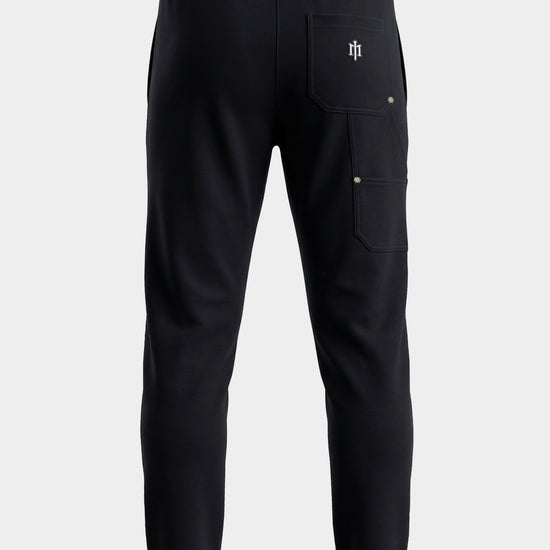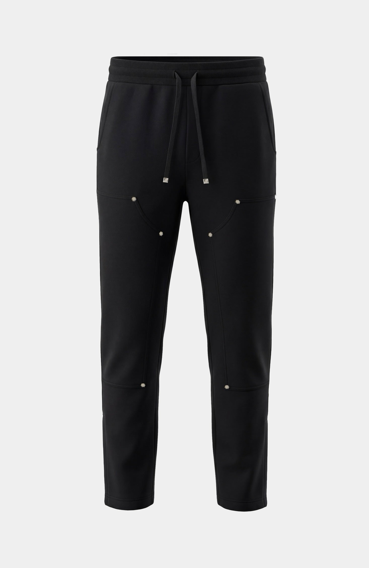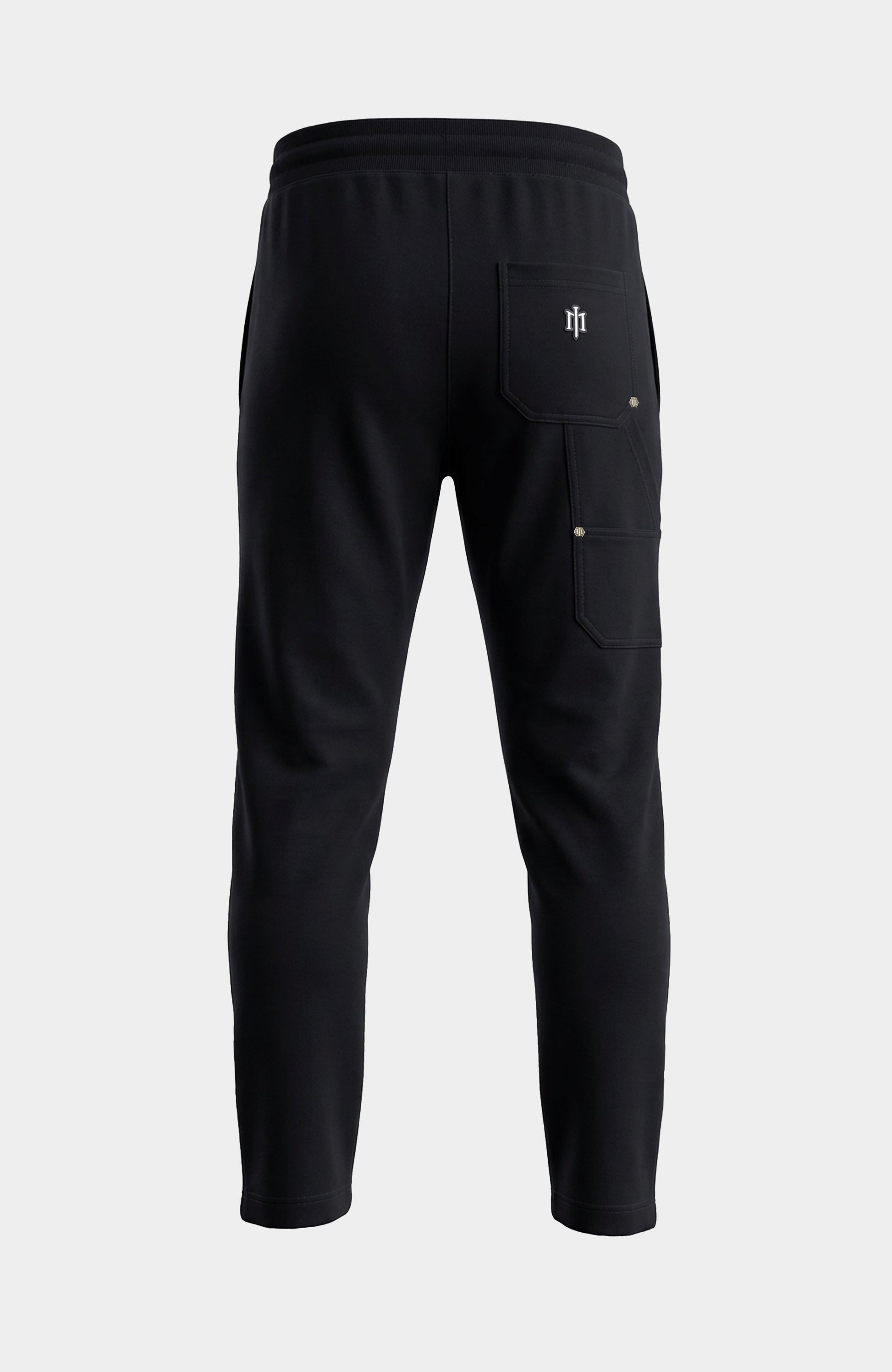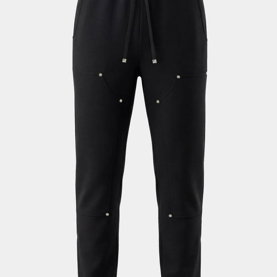 Pantalon jogger en coton noir avec taille élastique à cordon, détails métalliques argentés et poche cargo au dos, marquée d’un logo en silicone pour un look street chic et structuré.